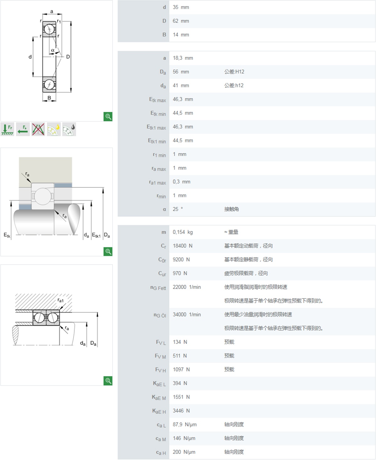| d | D | B | 額定載荷(KN) Cr | 額定載荷(KN) Cor | 極限轉(zhuǎn)速(rpm) 脂潤滑 | 極限轉(zhuǎn)速(rpm) 油潤滑 | 額定載荷(KN) Cr | 額定載荷(KN) Cor | 極限轉(zhuǎn)速(rpm) 脂潤滑 | 極限轉(zhuǎn)速(rpm) 油潤滑 | ||