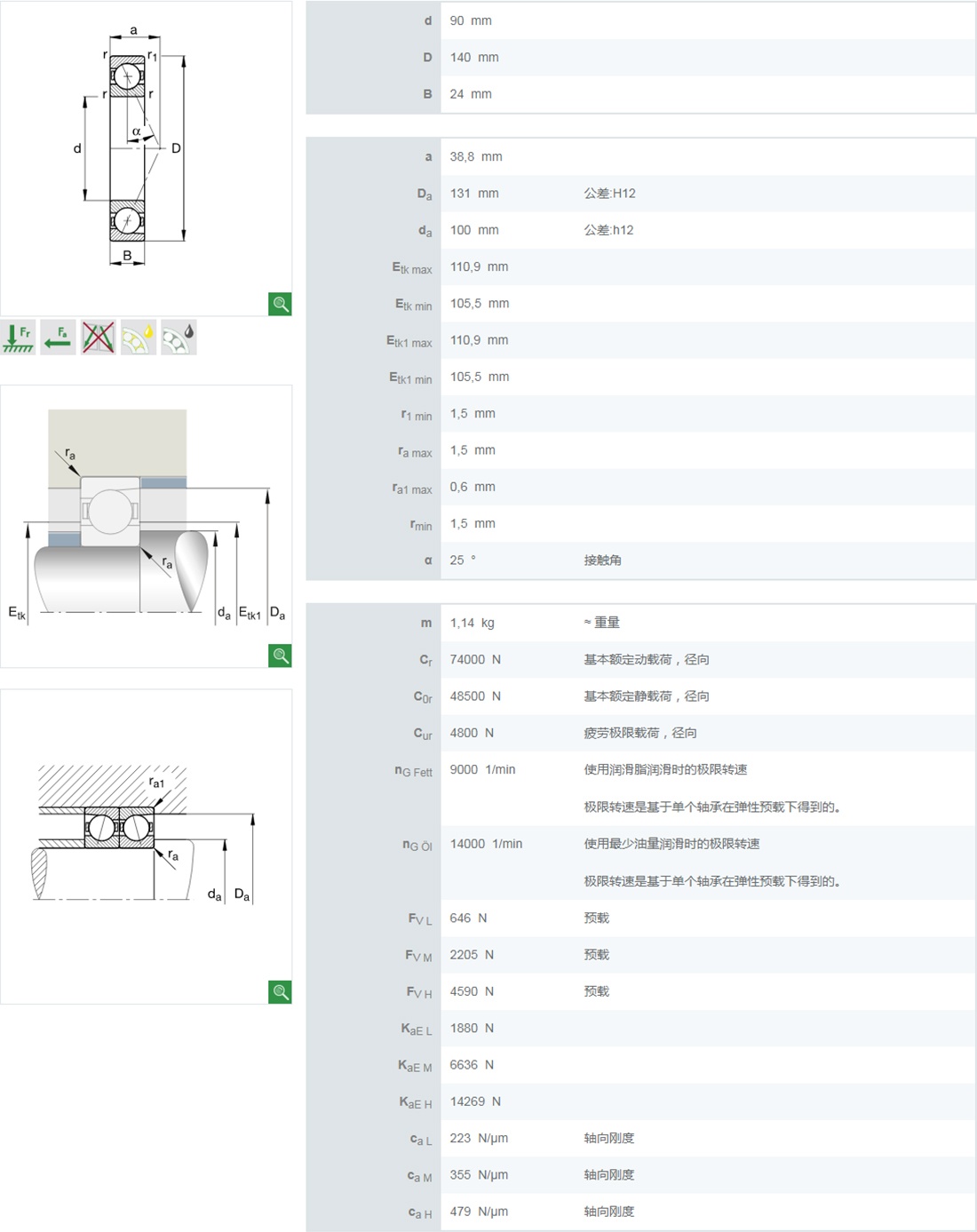 | d | D | B | 額定載荷(KN) Cr | 額定載荷(KN) Cor | 極限轉速(rpm) 脂潤滑 | 極限轉速(rpm) 油潤滑 | 額定載荷(KN) Cr | 額定載荷(KN) Cor | 極限轉速(rpm) 脂潤滑 | 極限轉速(rpm) 油潤滑 | ||