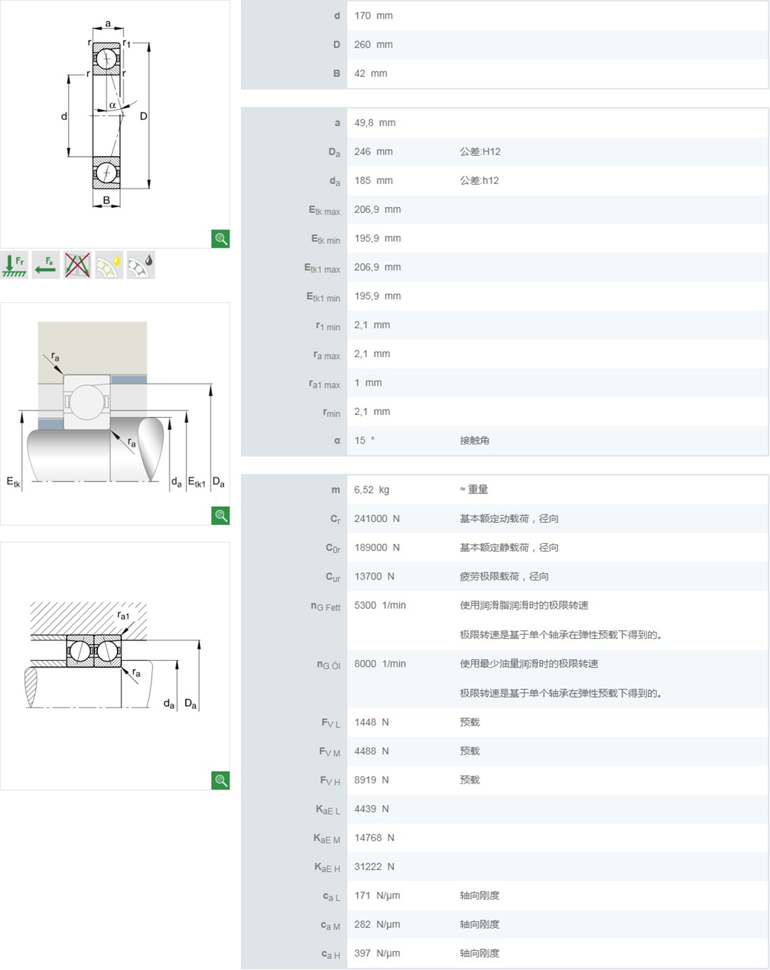 | d | D | B | 額定載荷(KN) Cr | 額定載荷(KN) Cor | 極限轉(zhuǎn)速(rpm) 脂潤滑 | 極限轉(zhuǎn)速(rpm) 油潤滑 | 額定載荷(KN) Cr | 額定載荷(KN) Cor | 極限轉(zhuǎn)速(rpm) 脂潤滑 | 極限轉(zhuǎn)速(rpm) 油潤滑 | ||