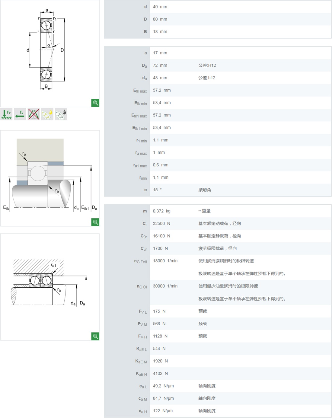 | 7208B | 40 | 80 | 18 | 30.6 | 21.3 | 7500 | 10000 | - | - | - | - | 0.382 |